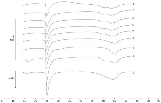 Calorimetric curves, in heating mode, of MLV put in contact with empty SLN, at pH 7.4, at increasing incubation time. The numbers on the right side of the curves refer to the calorimetric scans. The curves 0 refer to the samples before contact.