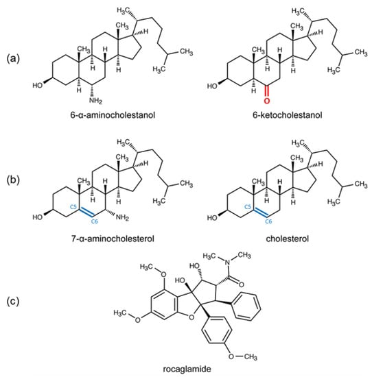 Sterols, 7-α-aminocholesterol, cholesterol, 6-ketocholestanol and rocaglamide A were purchased from Sigma-Aldrich (St. Louis, MO, USA) under the references R207578, C3045, K1250 and SML0656, respectively. The structures of the compounds used are shown in Figure 1. The compounds were dissolved in dimethyl sulfoxide (DMSO; Sigma-Aldrich, St. Louis, MO, USA) to make stock solutions.