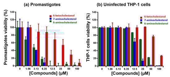 The tested compounds revealed no significant toxicity on the THP-1 macrophages. The viability of the macrophages treated with each compound was ~90–100% at the concentration corresponding to the IC50 on the promastigotes (Figure 4). The CC50 values were calculated with GraphPad software as 17.5 μM and 77 μM for 7-α-aminocholesterol and 6-ketocholestanol compounds, respectively. Cholesterol did not affect the viability of the macrophages treated even at 100 µM.
