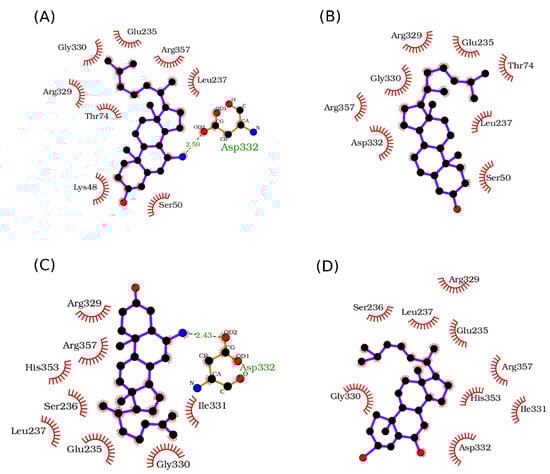 The scores of the selected docking poses showed that 7-α-aminocholesterol and 6-α-aminocholestanol had the best estimated binding energies with LieIF4A, which confirmed the experimental results (Table 4). The number of poses within the retained clusters brought additional evidence for the plausibility of the selected poses. Noticeably, the cycle containing carbons 6 and 7 occupied the same spatial location on all docking poses (Figure 5). The amino groups on carbons 7 and 6 of 7-α-aminocholesterol and 6-α-aminocholestanol compounds, respectively, established H-bonds with Asp332 (D332) from motif V (Figure 5). An interaction diagram to highlight the protein-inhibitor interactions is indicated in Figure 6, displaying the established contacts (H-bonds and hydrophobic) between the docked molecules and the protein. These interactions were not observed for 6-ketocholestanol, as it presented a keto group at position 6 (Figure 1). Cholesterol had no functional group at this position and did not present any equivalent H-bond at this position. These findings rationalized the correlation between the presence of the amino group and the inhibitory effect on the LieIF4A enzymatic activity.