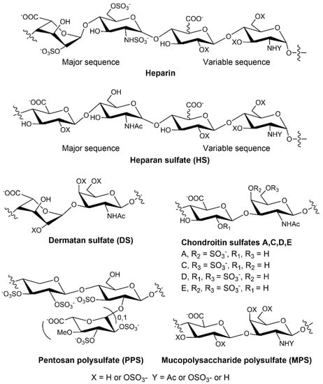PPS, a heparin mimetic with a highly sulfated polysaccharide backbone, is synthesized through the chemical sulfonation of a plant-derived β-(1 → 4)-xylan. MPS is a semisynthetic GAG with a backbone that is isolated from mammalian cartilage before its chemical sulfation. Importantly, PPS is an FDA-approved active pharmaceutical ingredient of the oral drug Elmiron. The FDA has approved PPS as an oral anti-thrombotic agent for the management of patients with interstitial cystitis, and it is also used for clinical disorders such as antagonism of enzymatic activities and inhibition of HIV infectivity. MPS has been used for the topical treatment of superficial phlebitis, hematomas, and sports-related injuries [].