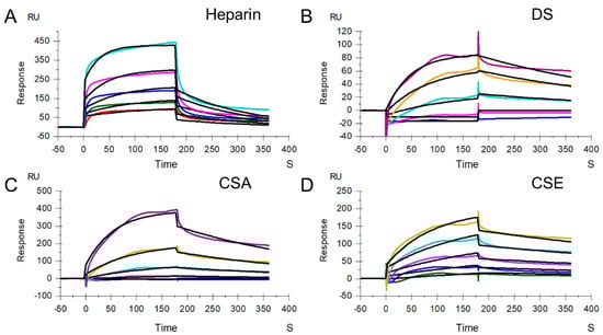 Heparin and HS interactions with VARV A27 and MPXV A29 have been demonstrated by other researchers []. It is unknown whether other GAGs have broad binding affinity for MPXV A29, so the strength of their binding remains to be determined. Heparin/HS are GAGs, with HS produced by all cell types, which is a component of the extracellular matrix []. Heparin is distinct from HS (less than one sulfo group per disaccharide unit), in that it is produced primarily by mast cells, with a higher degree of sulfation (approximately three sulfo groups per disaccharide unit). DS, also previously referred to as CSB, is found primarily in skin, as well as in blood vessels, heart valves, tendons, and lungs. DS consists of repeating disaccharide units, N-acetyl galactosamine (GalNAc) and iduronic acid (IdoA), which are sulfated at multiple positions and have, on average, one sulfo group per disaccharide unit []. CS is an important structural component of cartilage. CS chains are unbranched polysaccharides of variable lengths, containing two alternating monosaccharides: glucuronic acid (GlcA) and GalNAc. CS can be divided into CSA (chondroitin-4-sulfate) and CSC (chondroitin-6-sulfate), both having, on average, one sulfo group per disaccharide unit; and CSD (chondroitin-2,6-sulfate) and CSE (chondroitin-4,6-sulfate), both having, on average, two sulfo groups per disaccharide unit. Here, different GAG chips, including heparin, DS, CSA, and CSE chips, were prepared to quantify the binding affinity for MPXV A29. Sensorgrams of the interactions of GAGs with MPXV A29 are shown in Figure 3.