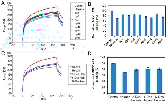 We prepared oligosaccharides of different lengths, from tetrasaccharide (dp4) to octadecasaccharide (dp18), by enzymatic degradation of heparin, to examine the effect of the saccharide chain length of heparin on the MPXV A29 interaction. Solution/surface competition experiments were performed using SPR to examine the inhibition of different heparin oligosaccharides for the interaction between heparin (on the surface) with MPXV A29. The same concentration (1000 nM) of heparin oligosaccharides was mixed in the MPXV A29 protein (250 nM)/heparin interaction solution. Solution competition studies between heparin and heparin oligosaccharides are shown in Figure 4A,B. All the oligosaccharides of heparin showed inhibition of MPXV A29 binding to the heparin surface, compared with the heparin control. Heparin inhibited the binding of MPXVA29 to the surface-immobilized heparin by 30%. Heparin oligosaccharides from dp4 to dp18 inhibited 15% to 27% of the binding, but there was no apparent glycan-length binding dependence.