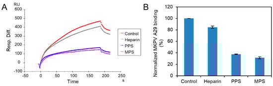 MPXV A29 was premixed with the same concentrations of PPS, MPS, or heparin, before injection into the heparin chip. When the active binding sites on the MPXV A29 were occupied by glycan in solution, its binding to the surface-immobilized heparin decreased, resulting in a reduction in signal. Solution competition between heparin and sulfated glycans is shown in Figure 5. PPS and MPS potently inhibited the MPXV–heparin interaction by 62% and 69%, respectively. This could be due to the level of sulfation being higher for MPS and PPS compared with heparin. The average heparin disaccharide contains ~2.7 sulfo groups, while MPS disaccharide has >4 sulfo groups and PPS disaccharide has >3 sulfo groups; the high level of sulfo groups enable strong interaction with MPXV A29.