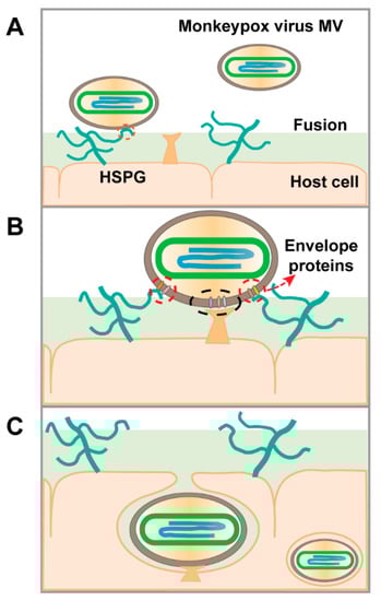 Proposed model of MPXV host-cell entry. (A) Virions land on the host-cell surface by binding to heparan sulfate proteoglycan (HSPG). (B) Then, host-cell surface proteases initiate viral-host-cell membrane fusion. (C) Finally, virions enter the host cell.