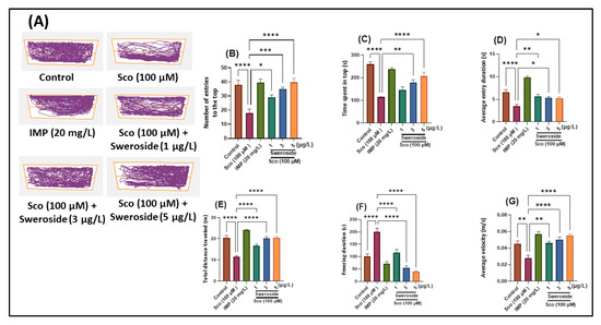 Figure 1 depicts the primary effects of Sco (100 µM) and sweroside (2.79, 8.35, and 13.95 nM) treatment on the anxiety response in the NTT test. Figure 1A shows how the locomotor tracking behaviors of distinct groups of zebrafish at the top and bottom zones of the tank vary. The one-way ANOVA revealed that the treatment had significant overall effects on the number of entries to the top [F (5, 54) = 11.09] (p < 0.0001) (Figure 1B), time spent in top [F (5, 54) = 21.78] (p < 0.0001) (Figure 1C), average entry duration [F (5, 54) = 31.57] (p < 0.0001) (Figure 1D), total distance traveled [F (5, 54) = 38.98] (p < 0.0001) (Figure 1E), freezing duration [F (5, 54) = 31.43] (p < 0.0001) (Figure 1F), and average velocity [F (5, 54) = 11.39] (p < 0.0001) (Figure 1G).