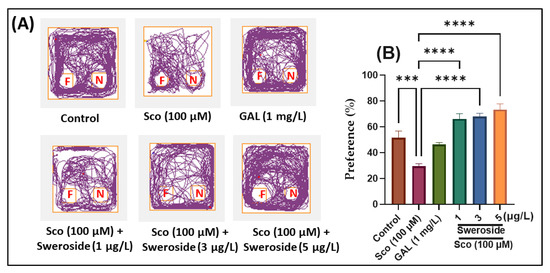 Evaluation of recognition memory in Sco-treated zebrafish subjected to sweroside treatment at doses of 2.79, 8.35, and 13.95 nM in the NOR test: (A) Representative tracking locomotion patterns in various groups; (B) Preference (%). Data are presented as means ± S.E.M. (n = 10 animals per group). *** p < 0.0001 and **** p < 0.00001 (Tukey’s post hoc analyses). Galantamine (GAL, 2.71 μM) was used as reference positive drug.