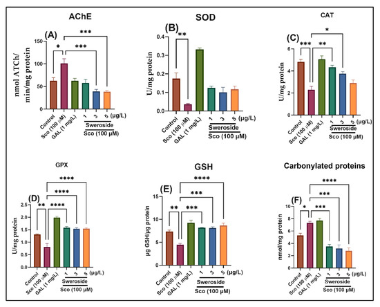 Effects of sweroside (2.79, 8.35, and 13.95 nM) on (A) AChE; (B) Superoxide dismutase (SOD); (C) Catalase (CAT); (D) glutathione peroxidase (GPX)-specific activities; (E) Reduced glutathione (GSH) and (F) carbonylated protein levels. Data are represented by means ± S.E.M. (n = 10 animals per group). * p < 0.01, ** p < 0.001, *** p < 0.0001, and **** p < 0.00001 (Tukey’s post hoc analyses). Galantamine (GAL, 2.71 μM) was used as a reference positive drug.