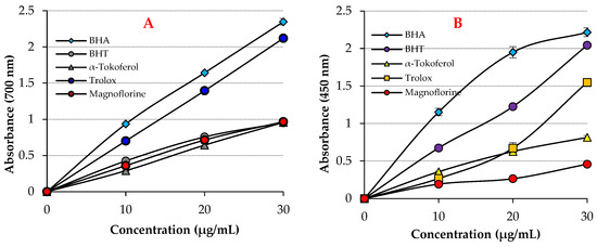 A variety of methodologies and activity assessments are used to prevent oxidation using antioxidants. As seen in Figure 1A and Table 1, Magnofluorine showed effective Fe3+-reducing ability (p < 0.01). The reducing effect of Magnofluorine and the positive controls increased in a concentration-dependent manner (30 μg/mL) for the tested materials. The Fe3+ reducing ability of Magnofluorine and the positive controls decreased as follows: BHA (λ700: 2.347, r2: 0.9086) > Trolox (λ700: 2.119, r2: 0.9586) > Magnofluorine (λ700: 0.967, r2: 0.9938) > α-Tocopherol (λ700: 0.957, r2: 0.9863) ≥ BHT (λ700: 0.952, r2: 0.9154). The results demonstrated that the Fe3+ reduction ability of Magnofluorine is better than that of BHT and α-Tocopherol, but lower than that of Trolox and BHA. Additionally, previous studies have reported the Fe3+-reducing absorbance values to be 0.278 (r2: 0.9567) [12], 2.769 (r2: 0.9945) [43], 0.739 (r2: 0.9778) [3], 0.432 (r2: 0.9981) [44], 2.509 (r2: 0.9906) [45], and 2.428 (r2: 0.9474) [46] for similar quantities of usnic acid, caffeic acid, coumestrol, uric acid, CAPE, and tannic acid, respectively.