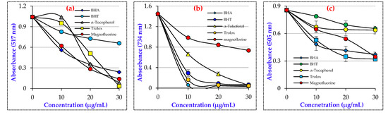 The radical scavenging ability of Magnofluorine was determined using the antioxidant assays, DPPH•, ABTS•+, and DMPD•+ methods. Magnofluorine exhibited considerable DPPH•, ABTS•+, and DMPD•+ scavenging activities. The results exhibited that Magnofluorine significantly scavenged the DPPH radical in a concentration-dependent manner (10–30 μg/mL). In the DPPH• removal studies, the IC50 value for Magnofluorine was found to be 10.58 μg/mL (r2: 0.9908) (Table 2 and Figure 2A). In contrast, the IC50 values were calculated as 7.059 μg/mL (r2: 0.9614), 10.10 μg/mL (r2: 0.9015), 11.31 μg/mL (r2: 0.9642), and 25.95 μg/mL (r2: 0.9221) for Trolox, BHA, α-tocopherol, and BHT, respectively. In this context, the IC50 value was calculated to be 3.30 μg/mL [45], 6.96 μg/mL [47], 16.06 μg/mL [48], 17.77 μg/mL [49], 20.0 mg/mL [51], 30.6 μg/mL [52], 34.9 μg/mL [53], 49.50 μg/mL [12], and 77.00 μg/mL [50] for CAPE, resveratrol, eugenol, olivetol, silymarin, L-Adrenaline, curcumin, usnic acid, and taxifolin, respectively.