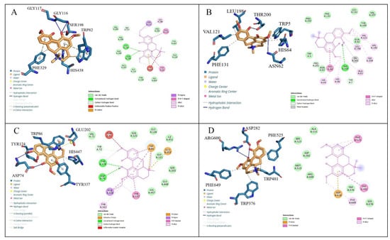 (A). The 2D and 3D interactions of BChE (6T9P) and Magnofluorine, (B). The 2D and 3D interactions of Carbonic anhydrase (II) enzyme (3HS4) and Magnofluorine, (C). The 2D and 3D interactions of AChE enzyme (4EY7) and Magnofluorine, (D). The 2D and 3D interactions of α-glycosidase enzyme (5NN8) and Magnofluorine.