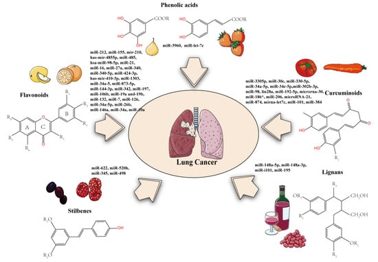 Recent studies have shown that miRNAs are involved in polyphenol-induced carcinogenesis inhibition. Here, we reviewed the functions of polyphenols in oncogenic and tumor-suppressive microRNAs in lung cancer. We also reviewed and discussed the potential application of polyphenol-regulated microRNAs in lung cancer treatment.