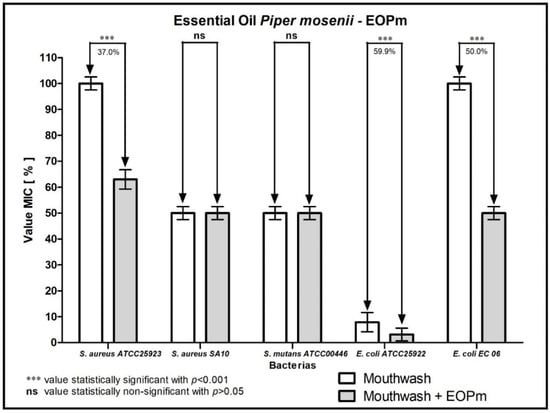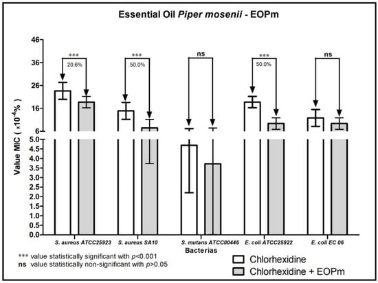 The essential oil of Piper mosenii tested showed modifying action of antibiotics, chlorhexidine, and mouthwash, where EOPm presented more relevant results when associated, reducing the MIC of antibacterial substances. In this way, the modulation characteristics may be related to the phytochemical constituents contained in the essential oil through peculiarities of the bacterial cell wall [].