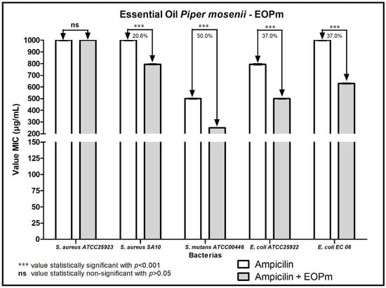 In the association of EOPm with the antibiotic ampicillin (Figure 3), it is possible to observe that there was a synergistic effect against the strains of S. mutans ATCC00446 and S. aureus SA10, considering that the MIC reduced 50% and 20.6%, respectively. Furthermore, this effect was also verified against E. coli EC06 and E. coli ATCC25922 strains, with a 37% decrease in ampicillin MIC for both.