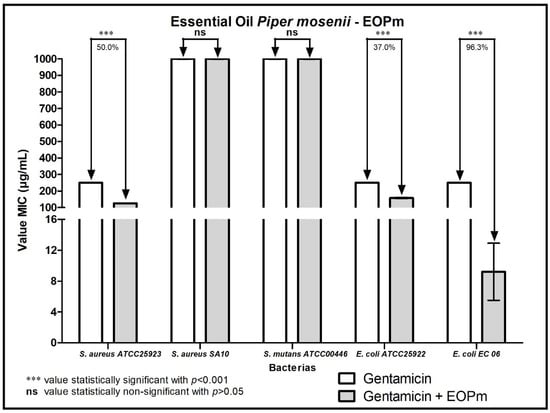 It is worth noting that in relation to the bacterium Escherichia coli, the emergence of resistance has recently been described, including to gentamicin, which is worrying because this species is the most common in infections caused by Gram-negative bacteria in humans []. However, when the EOPm modulating action with gentamicin was tested in this research, there was a significant synergistic effect for the two Escherichia coli strains.