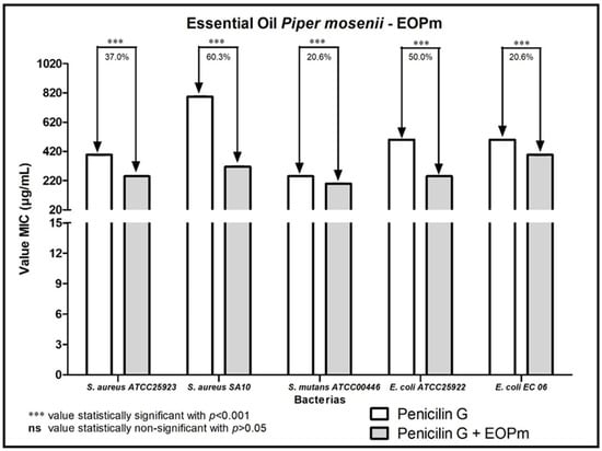 Figure 5 represents the result of the combination of the EOPm together with Penicillin G showed a reduction in MIC against all strains tested. Against the strain of S. aureus SA10, the reduction was 60.3%, while in the test of the association of products against the strain of E. coli ATCC25922 the reduction of the MIC was 50%. The S. aureus ATCC25923 strain, in turn, was inhibited with the MIC of the antibiotic reduced by 37%, while against S. mutans ATCC00446 and E. coli EC06 the combination showed lower percentages of MIC reduction, with 20.6%.