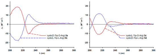 Electronic circular dichroism spectra observed for diketopiperazines 5a and 5b (left) and 5c and 5d (right).
