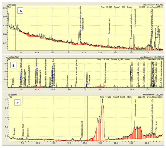 Chromatogram of (A) crude methanolic extract of Rumex hastatus (Rh.Cr), (B) n-hexane (Rh.n-Hex) and (C) ethyl acetate fraction (Rh.ETAC).