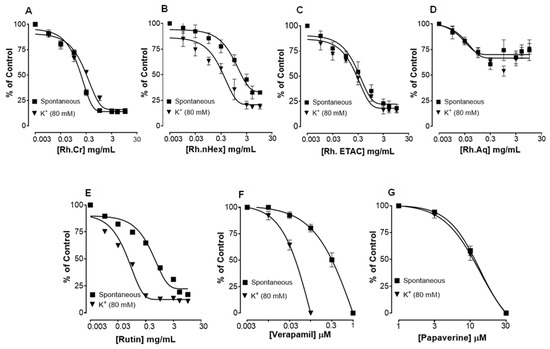 Concentration-dependent inhibitory effect on spontaneous and K+ (80 mM) induced contractions of (A) Rumex hastatas crude extract (Rh.Cr) and fractions: (B) n-hexane (Rh.n-Hex), (C) ethyl acetate (Rh.ETAC), (D) aqueous (Rh.Aq), (E) rutin (F) verapamil and (G) papaverine in isolated rabbit jejunum preparations. Values are expressed as mean ± SEM (n = 4–5).