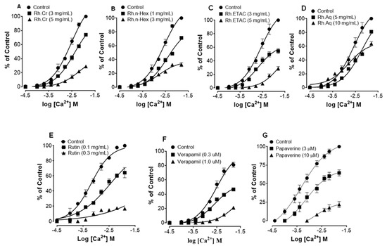 Concentration-response curves of Ca2+ in the absence and presence of the increasing concentrations of (A) Rumex hastatas extract (Rh.Cr) and fractions: (B) n-hexane (Rh.n-Hex), (C) ethyl acetate (Rh.ETAC), (D) aqueous (Rh.Aq), (E) rutin (F) verapamil and (G) papaverine in isolated rabbit jejunum preparations. Values are expressed as mean ± SEM (n = 4-5).