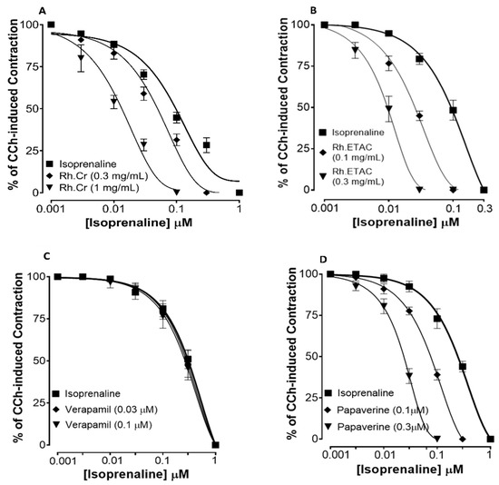 Concentration–response curves of isoprenaline against carbachol (CCh)-induced contractions in the presence of different concentrations of (A) Rumex hastatas extract crude (Rh.Cr), (B) ethyl acetate fraction (Rh.ETAC) (C) verapamil and (D) papaverine in isolated rabbit jejunum preparations. Values are expressed as mean ± SEM (n = 4–5).