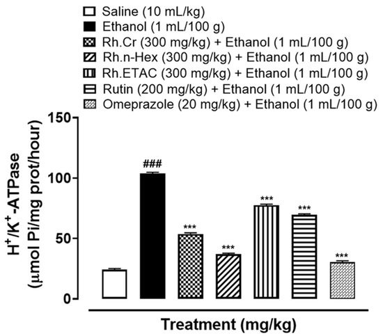 Abnormal activity of H+/K+-ATPase is closely related to gastric ulcers. In the ethanol-treated group (1 mL/100 g) the H+/K+-ATPase activity was significantly increased. Treatment with Rh.Cr, Rh.n-Hex, Rh.ETAC (300 mg/kg), rutin (200 mg/kg) and omeprazole (20 mg/kg) considerably reduced the activity (Figure 6).