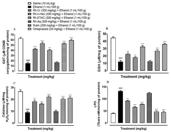 Effect of Rumex hastatus crude extract (Rh.Cr), n-hexane (Rh.n-Hex), ethyl acetate (Rh.ETAC), an aqueous fraction (Rh.Aq), rutin and omeprazole groups against (A) glutathione-S-transferase (GST), (B) reduced glutathione (GSH), (C) catalase and (D) lipid peroxidation (LPO) in ethanol-treated rats gastric tissues. Values are expressed as mean ± SEM (n = 3). One-way ANOVA with post-hoc Tukey’s test. ### p < 0.001 vs. saline group, ** p < 0.01, *** p < 0.001 vs. ethanol group.