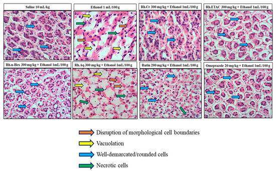 Figure 8 indicates the H&E staining performed on the gastric tissue. The gastric cells were evaluated for cellular changes or being intact in a normal state. Saline group (10 mL/kg) indicated intact shape, size and stain of the gastric cells, ethanol group (1 mL/100 g) indicates vigorous cellular changes as necrotic cells and hemorrhage can be observed with disruption of the morphological cell boundaries. Comparatively the Rh.Cr, Rh.n-Hex, Rh.ETAC (300 mg/kg), rutin (200 mg/kg) and omeprazole (20 mg/kg) treatment groups revealed relatively intact cell boundaries and cell morphological features as size, shape, vacuolation, and staining. Rh.Aq (300 mg/kg) treated group has relatively weak effects in restoring the cell morphological features.