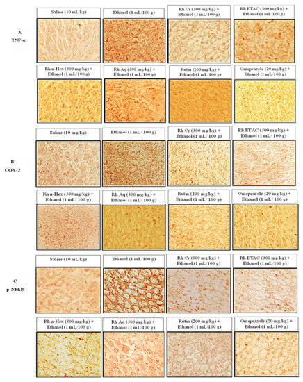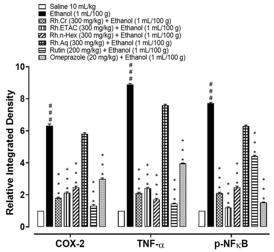 The ethanol (1 mL/100 g) treated group revealed hyper-expression of COX-2, TNFα, and p-NFkB in gastric tissues. In Rh.Cr, Rh.n-Hex, Rh.ETAC (300 mg/kg), rutin (200 mg/kg) and omeprazole (20 mg/kg) treated groups their expression reduced (Figure 9 and Figure 10).