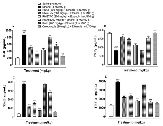 Effect of Rumex hastatus crude extract (Rh.Cr), n-hexane (Rh.n-Hex), ethyl acetate (Rh.ETAC), an aqueous fraction (Rh.Aq), rutin and omeprazole groups against (A) interleukin 8 (IL-8), (B) prostaglandin E2 (PGE2), (C) phosphorylated-nuclear factor kappa B (p-NFƙB) and (D) tumor necrosis factor alpha (TNF-α) in ethanol-treated rats gastric tissues, measured by enzyme-linked immunosorbent assay (ELISA) technique. Values are expressed as mean ± SEM (n = 3). One-way ANOVA with post-hoc Tukey’s test. ### p < 0.001 vs. saline group, * p < 0.05, ** p < 0.01, *** p < 0.001 vs. ethanol group.