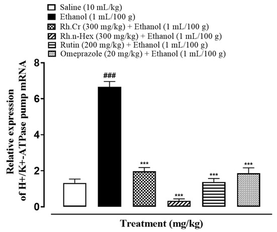 Inhibitory effect of Rumex hastatus crude extract (Rh.Cr), n-hexane (Rh.n-Hex) fraction, rutin and omeprazole against mRNA of H+/K+-ATPase expression in ethanol-treated rats gastric tissues, using Real Time-Polymerase Chain Reaction (RT-PCR) technique. Values are expressed as mean ± SEM (n = 3). One-way ANOVA with post-hoc Tukey’s test. ### p < 0.001 vs. saline group, *** p < 0.001 vs. ethanol group.