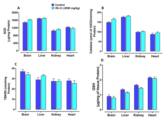 Effect of Rumex hastatus crude extract (Rh.Cr) against (A) superoxide dismutase (SOD), (B) catalase, (C) lipid peroxidation (LPO) and (D) reduced glutathione (GSH) in different tissues of rats.