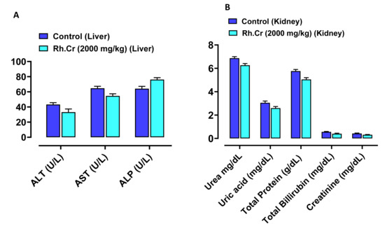 Effect of Rumex hastatus crude extract (Rh.Cr) against (A) liver function tests (LFTs) ALT (alanine aminotransferase), AST (aspartate aminotransferase) and ALP (alkaline phosphatase) (B) renal function tests (RFTs) of rats liver and kidney.
