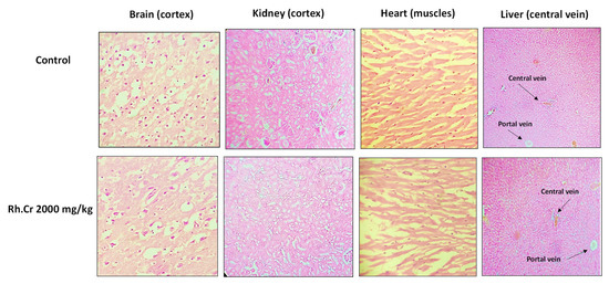 Histopathological slides showing the effect of Rumex hastatus crude extract (Rh.Cr) on vital organs of rats using hematoxylin and eosin staining histopathological technique. Bar 50 µm, magnification 40×.