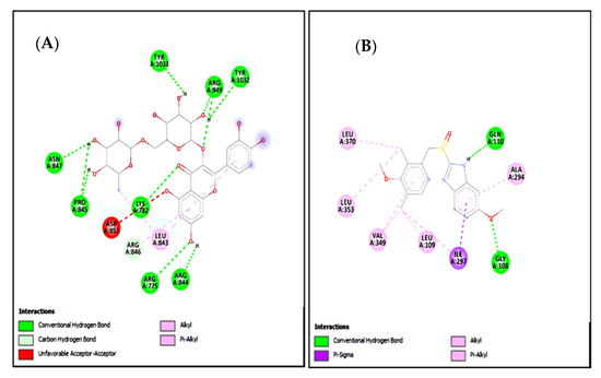 (A,B) represents 2D interactions of rutin and omeprazole against the target: H+/K+-ATPase respectively, evaluated through Biovia Discovery Studio 2016.