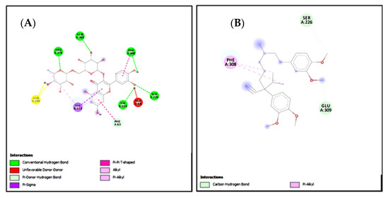 (A,B) represents 2D interactions of rutin and verapamil against the target: Voltage-gated L-type calcium channels respectively, evaluated through Biovia Discovery Studio 2016.