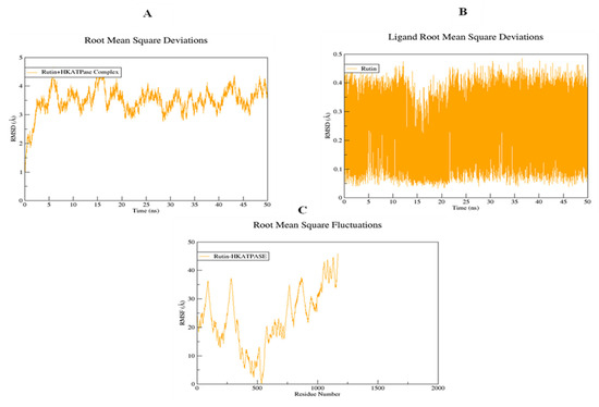 Root mean square deviations of backbone atoms of (A) rutin-H+/K+-ATPase docked complex, (B) rutin, and (C) root mean square fluctuations of the backbone atoms of the rutin-H+/K+-ATPase docked complex.