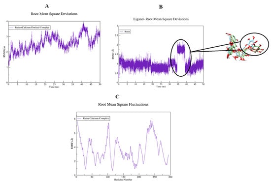 Root mean square deviations of backbone atoms of (A) rutin-voltage gated L-type calcium channel docked complex, (B) rutin, and (C) root mean square fluctuations of the backbone atoms of the rutin-voltage gated L-type calcium channel docked complex.