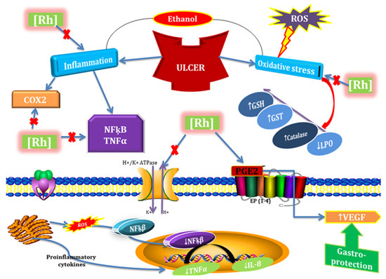 Graphical representation to elaborate the possible mechanism underlying antioxidant, anti-inflammatory, and anti-ulcer potential of Rumex hastatus (RH) against ethanol-induced gastric ulcer. ROS (reactive oxygen species), COX2 (cyclooxygenase 2), NFƙB (nuclear factor kappa B), TNF-α (tissue necrosis factor α), IL-8 (interleukin 8), PGE2 (prostaglandins E2), GSH (glutathione), GST (glutathione-S-transferase), LPO (lipid peroxidation), VEGF (vascular endothelial growth factor).