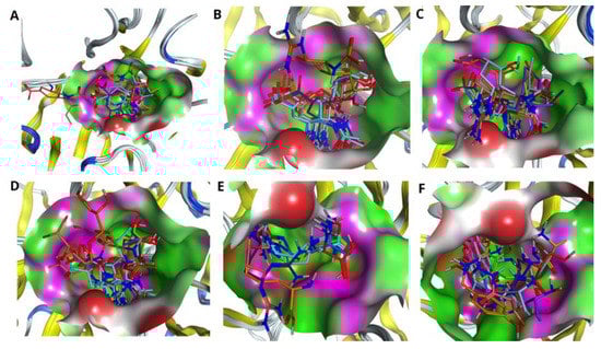 It is effective to look at the impact of mutations in the H7N9 NA catalytic site, as it leads to conformational changes of the binding pocket as well as various poses of drugs inside the cavity. Figure 2 demonstrates the superposition between Oseltamivirs (A), Zanamivirs (B), Peramivirs (C), Laninamivirs (D), L-Arginines (E) and Benserazide hydrochlorides (F) taken from docking of the drugs with respect to the pocket of wild type (used here as a reference) as well as mutated N9 NAs. It is worth noting that the most affected by R to K mutation inside the active site are the drugs Oseltamivir, L-Arginine and Benserazide hydrochloride. The calculated values of RMSDs for such drugs show a huge shift with respect to the structure bound to the wild type N9 (please refer to Table 6). Mutation of the pocket residues had less of an impact on Zanamivir, Peramivir and Laninamivir. As Table 6 shows, single mutations (R294K, R119K and R372K) do not affect significantly the binding poses of the drugs; the values of RMSD lie within 1.5 Å for the drugs Zanamivir and Laninamivir and are less than 1 Å for the drug Peramivir. The drastic conformational changes as well as shift of the binding pose in all drugs causes the double R294_119K mutation inside the binding pocket of N9 (see Figure 2A–F, all drugs are highlighted in orange, and Table 6). In this case the most affected drug is Zanamivir with an RMSD value of 7.3 Å; the least affected is the drug Peramivir with an RMSD value of 4.6 Å. Triple R294_119_372K mutation also caused significant displacement of the binding poses in all considered drugs, except Zanamivir (see Figure 2A–F, all drugs are highlighted in salmon, and Table 6). In this case, the most affected by such mutations is the drug Oseltamivir with an RMSD value of 10.8 Å and the least affected is Zanamivir with an RMSD value of 0.7 Å.