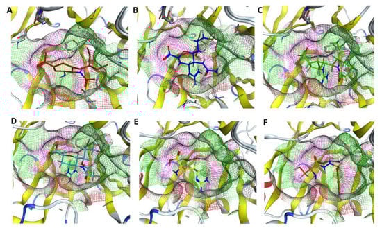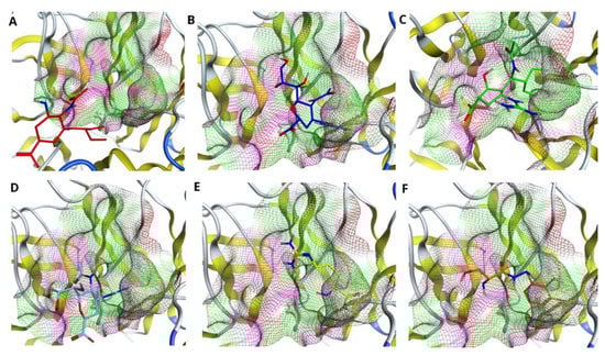 Next, we considered double R294_119K mutation inside the active site of N9 and fitness of the drugs to such a pocket. In this case, the mutation of two arginines at positions 294 and 119 into lysines not only affected the shape of the pocket, but also the positions of the drugs inside the pocket (see Figure 5A–F). In particular, all drugs, except Peramivir and Benserazide hydrochloride (see Figure 5C,F), are shifted with respect to the visual center of the pocket. Despite all these changes, Peramivir remains the drug that fits the pocket best in this case.