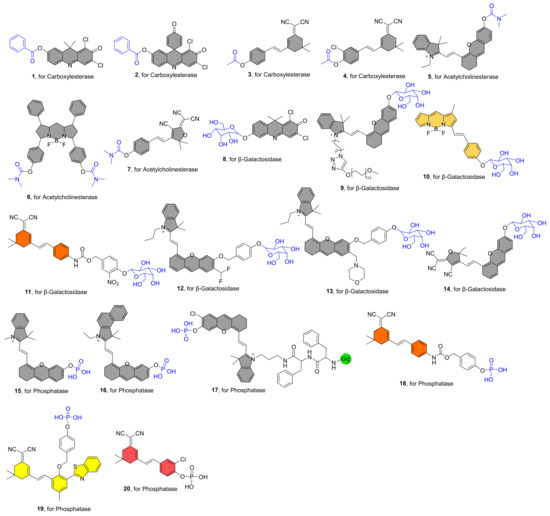 In order to reflect the levels of biological tissue enzyme expression, the researchers used imaging techniques like positron emission tomography (PET), positron emission tomography (PET), single photon emission computed tomography (SPECT), and so on [3,4,5]. Without requiring surgery or invasive biopsies, these in vivo molecular imaging methods define the enzyme levels in the sick area under examination. The methods now employed in medical imaging applications, meanwhile, are pricy, need a long acquisition time, have a limited range of sensitivity, and are unable to discern subcellular features. Instead of using ionizing radiation, optical imaging methods may create affordable, real-time pictures with great sensitivity and spatial resolution. In preclinical research, fluorescence microscopy is frequently used to measure enzyme activity, and as technology develops, it may also be employed in clinical molecular imaging in the future [6,7,8]. Furthermore, because to their simplicity in synthetic modification, small-molecule enzyme probes can locate enzymes with great sensitivity and specificity in their natural environment [9,10,11]. In actuality, the detection of numerous analytes, including metal ions, small molecules, and biomacromolecules, has been extensively done using fluorescence imaging [12,13,14,15,16,17,18,19,20,21,22]. Near-infrared (NIR) emitting (650–900 nm) fluorescent compounds, in particular, are utilized in biological systems because they can prevent autofluorescence, reduce photon scattering, and promote deep tissue penetration [23,24]. NIR fluorescent dyes have acquired considerable support in clinical optical imaging applications due to continual advancements in the field of deep tissue optical microscopy and advances in imaging algorithms [25]. Significant progress has been achieved in the creation of NIR fluorescence probes based on enzyme activation during the last decade, which is unquestionably advantageous to the early detection and treatment of associated disorders [8,23,26,27,28]. As a result, it fuels the ongoing development of novel NIR enzyme probes. In this study, we will look into NIR fluorescent probes with various photophysical characteristics and their use in detecting enzyme activity under biological settings. We briefly discuss one or more typical near-infrared fluorescent probes for each class of enzymes that may be used to observe enzyme activity in biological systems.