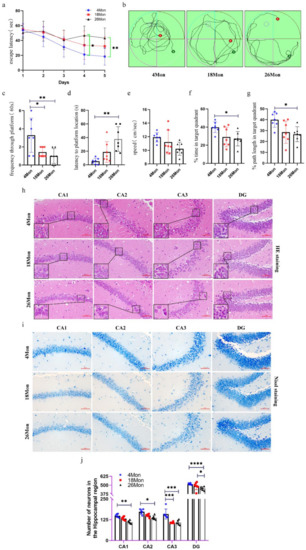 The Morris water maze test is a major behavioral testing method for measuring cognitive impairment of rodents. To further explore whether the changes in cognitive function associated with age, four-, 18-, 26-month-old male mice were chosen as our research subjects. As the training progressed, the latency to reach the platform was significantly decreased in the 26-month-old group at the fourth and fifth day (Figure 1a), indicating that the older mice showed significant learning deficiency during the sessions. Three typical movement trajectories on the sixth day are presented (Figure 1b), the time and path length in the target quadrant, the swimming speed, the tracking pathway and the latency to location were also analyzed (Figure 1c–g). The four-month-old mice spent the least amount of time to get the location of the original platform and took much more times swimming through the platform (Figure 1c,d). Compared with the four -month-old mice, the 18-month-old mice and the 26-month-old mice spent less time in the target quadrant along with the path length in the target quadrant (Figure 1f,g). In addition, the average speed was lower in the 18-month-old mice and the 26-month-old mice than in the four-month-old mice (Figure 1e), but without significant differences from each other. Since the data show differences in behavioral test, and the hippocampus is a crucial structure in memory circuits and is firstly and foremostly responsible for memory and learning functions, the HE [7] and Nissl staining were performed to see whether the structural integrity of the hippocampus was changed or the neurons start to lose. HE staining of the hippocampal neurons revealed that neurons in the group of four-month-old mice had rich cytoplasm, slightly round stained nucleus, and clear formation. On the contrary, in the group of 24-month-old mice, degenerated neurons showed shrinking cytoplasm and bodies, and most of the degenerated neurons revealed deep stained nucleus and irregular morphology (Figure 1h). The neuronal loss was evaluated with age. As shown in Figure 1i, four-month-old mice showed highly dense pyramidal layer neurons with intact structure. In contrast, the neurons appeared atrophied and pyknotic in 26-month-old mice. Meanwhile, the numbers were also lower than those in four-month-old mice, especially in the region of CA1, CA3, and DG, which can be seen intuitively from Figure 1j.