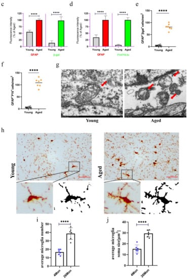 A variety of cells exist in the brain, mainly including neurons, astrocytes and microglia, which type of cells play a key role in the initiation of aging remains unclear. The expression of β-gal and P16INK4a can be used as senescent markers [8]. Here, the four-month-old mice were defined as young group and the 26-month-old mice were defined as aged group. With the increasing age of mice, the expressions of β-gal and P16INK4a were significantly increased (Figure 2a–d). We also found a significant increase in the density of βgal+ astrocyte (GFAP+), localizing in the cytoplasmic compartment and P16+ astrocyte (GFAP+), localizing in the nuclear compartment (Figure 2e,f). So, to assess whether changes in the organelle structure of astrocytes occur during the senescent progress, electron microscopy was used to examine the ultrastructure of the mitochondria in astrocytes. Figure 2g shows that the mitochondria may have changed from a strip shape to a rounded one with age and the cristae were vague and some of them disappeared in aged mice. Data also showed that a progressive enlargement of microglial size as the activation state and phagocytic capacity of the cells enhances (Figure 2h-j). Usually, amoeboid microglia was considered as higher activation state [9].