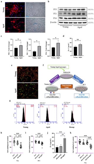 To deeply investigate the changes in a range of physiological functions of astrocytes during senescence in vitro, astrocytes were isolated from Wistar rat pups and made identification by the marker of GFAP (Figure 3a), the data showed highly purity of astrocytes. Natural senescent induction showed that SA-β-gal positive astrocytes were increased compared with those young astrocytes (Figure 3a). To systematically explore the altered phenotype of young and aged astrocytes, senescent markers of P53, P16, and P21 were tested, and, IL-6, which was collectively known as the senescence-associated secretory phenotype (SASP) [10] was also assessed. As is shown in Figure 3b,c, in aged astrocytes, the expression of P53, P21, and P16 was gradually increased, and the concentration of IL-6 in supernatant of aged astrocytes was elevated either (Figure 3d). Mitochondrial membrane potential was selected to detect whether the mitochondrial function remained normally, notably, the MMP showed significantly decreased in those aged astrocytes (Figure 3e). ROS production is the most common product upon cells facing oxidative stress, and compared with young astrocytes, the aged astrocytes showed increased intracellular ROS accumulation (Figure 3g). To assess whether these changes of astrocytes would have deleterious effects on microglia or neurons, we then examined the neurotoxicity of Neuro-2a cells treated with different conditioned medium (CM) (Figure 3f). The results showed that aged astrocytes derived CM or BV2 supernatants which were treated with those aged-astrocytes-derived CM significantly decreased Neuro-2a cell viability (Figure 3h,k), aged astrocytes-derived CM promoted a negative contribution to the survival of BV2 cells (Figure 3i), and the level of IL-6 in BV 2 supernatant was increased (Figure 3j), suggesting that substances released from aged-astrocytes may cause damage along with activating the BV2 cells and prompting cells to release inflammatory mediators to damage neurons.
