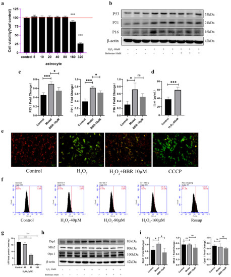 Another in vitro mitochondrion damaged model of astrocytes induced with oxidative stress was conducted. During model construction, we found that the cell viability showed significant decrease when the concentration reached 160 μM (Figure 4a). In order to cause mitochondrial damage rather than apoptosis, 80 μM of H2O2 was used as modeling concentration. Next, senescence markers were also detected to find out if the cells reached the senescence phenotype. As the data show in Figure 4b,c, the proteins expression of P53, P21, and P16 was significantly elevated after treating with H2O2. The cell viability of astrocytes treated with different concentration of berberine showed significant decrease when the concentration reached 160 μM (Figure S1), and administration of berberine showed a certain degree of decrease in these indicators, although the expression of P16 decreased but showed no significance, and the concentration of IL-6 in supernatant of astrocytes treated with H2O2 was elevated compared with those that didn’t (Figure 4d). Mitochondrial membrane potential also showed that exogenous H2O2 treatment caused MMP decrease and administration of berberine would do recovery of the damaged MMP (Figure 4e). ATP production is the most common product produced by mitochondria, compared with control cells, H2O2 treatment markedly lowered cellular ATP levels (Figure 4g). The ROS level was also significantly increased after treatment of H2O2 (Figure 4f). What is more, H2O2 treatment might have an effect on mitochondrial fission by elevating the expression of mitochondrial fission protein drp1 and decreasing the expression of mitochondrial fusion proteins Mfn2 and opa-1, although the mitochondrial fusion protein showed no significant decrease. The treatment of berberine could have an ameliorating effect on the mitochondrial function caused by oxidative stress (Figure 4h,i).