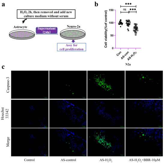 To confirm that mitochondrial dysfunction of H2O2-treated astrocytes is responsible for neuronal viability, the neurotoxicity of Neuro-2a cells cultured with conditioned medium isolated from H2O2-stimulated astrocytes (Figure 5a) was examined. Data showed that H2O2-treated astrocyte-derived CM significantly decreased the viability of Neuro-2a cells (Figure 5b). However, CM from astrocytes treated without H2O2 did not affect the viability of Neuro-2a cells. To confirm that apoptosis happens after treating with conditioned medium for 24 h, we also detected caspase-3 activity of Neuro-2a cells and found that Neuro-2a cells treated with H2O2-treated astrocyte supernatant presented a significant increase of caspase-3 activity at 24 h (Figure 5c). What is more, this effect was ameliorated by the administration of berberine.