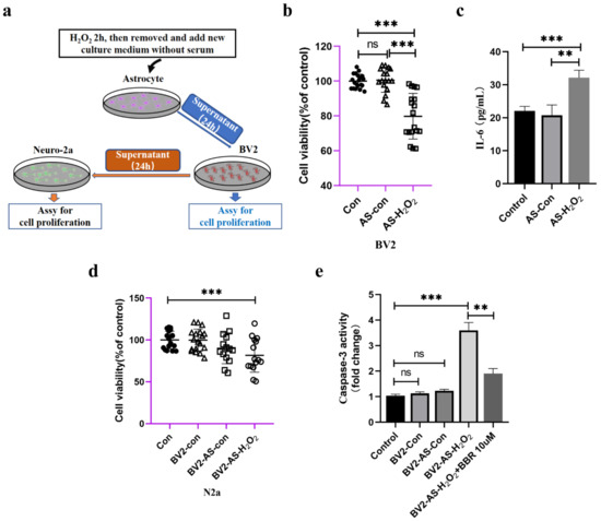 The indirect effect of aged astrocytes in communicating with microglia and neurons. (a) A schematic diagram of the interaction of cell supernatants. (b) Cell viability assay of BV2 cells by using astrocytes treated with or without H2O2 supernatant, n = 20. (c) Cytokine ELISA of IL-6 in culture medium of BV2 treated with astrocyte supernatant (treated with or without H2O2), n = 4. (d) Cell viability assay of N2a cells by using BV2 treated with astrocyte supernatant, n = 20. (e) The caspase-3 activity was measured with a caspase-3 assay kit, n = 6. All experiments were expressed as the mean ± S.D., analyzed by ANOVA followed by Tukey’s test, ** p < 0.01, *** p < 0.001, ns represents p > 0.05.