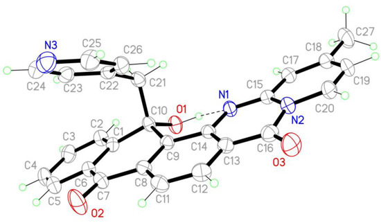 During the thermal opening of the triazinone ring 1 in the presence of 4-methylpyridine, in addition to the target annelated product 2d, a by-product formation with a mass of m/z 434 [M + 1] (LC-MS) was unexpectedly determined in the reaction mixture. In the 1H NMR spectrum of the by-product as compared with derivative 2d, in addition to the signals of aromatic protons and the methyl group, a doublet of doublets of two protons was recorded at 4.01 ppm. The 13C NMR spectrum of the by-product showed the absence of one of the signals of the carbonyl carbons of the 9,10-anthracenedione ring and the appearance of two new signals of carbon atoms at 74.78 and 53.04 ppm, respectively. To establish and confirm the structure of the isolated by-product, a single-crystal structural study was carried out. The X-ray study showed the unexpected formation of compound 4 (Figure 1), due to the addition of the methyl group of 4-methylpyridine to the carbonyl group of the anthraquinone fragment (Scheme 5).