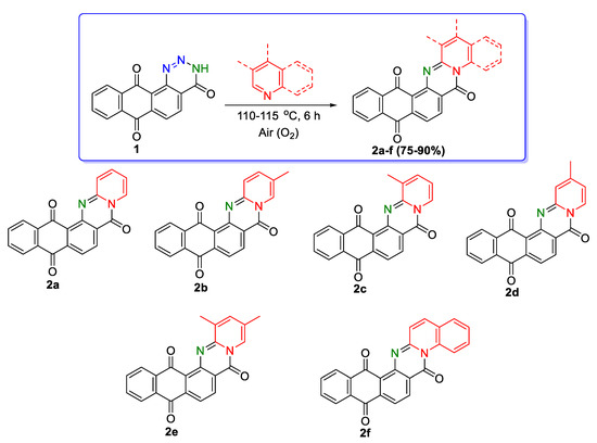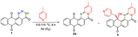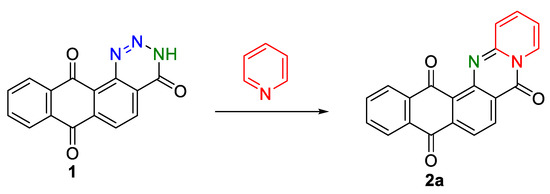 In the context of an extended study of reactivity of 9,10-anthracenedione derivatives [26,27,28,29,30,31,32], in this work, we investigated the behavior of the [1,2,3]triazine-3(H)-4-one fragment of the previously synthesized anthratriazinetrione 1 [14] in the reaction of the thermal opening of the cycle. Pyridine was used as a model dienophile in the possible [4+2]-cycloaddition reaction (Scheme 1) with in situ-generated 9,10-dioxoanthracene iminoketene (heterodiene) in various molar ratios and the presence of a number of solvents (Table 1). Atmospheric oxygen was used as a ”green” oxidant in the reaction.